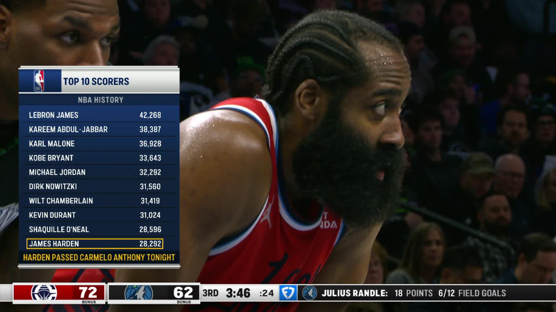哈登34+5+6跻身历史得分前10快船惜败森林狼,小卡20分华子15+6